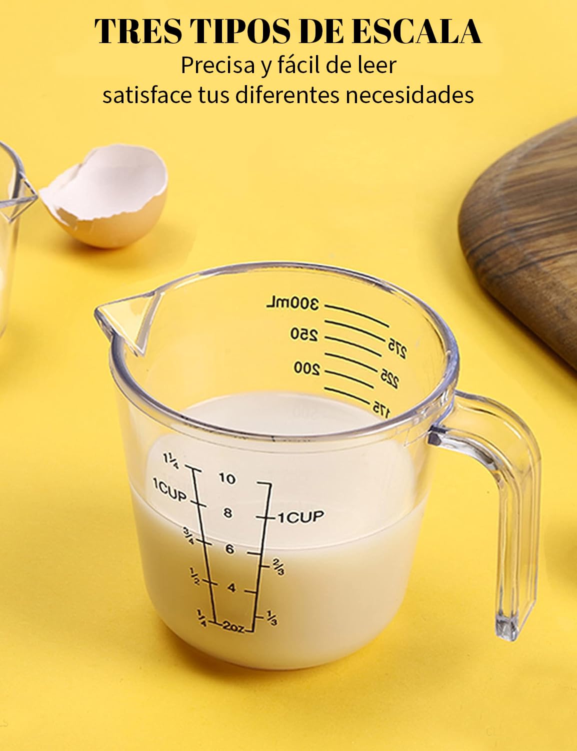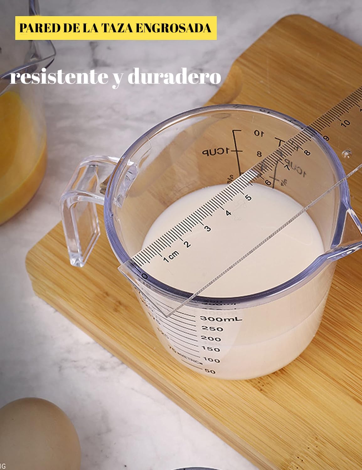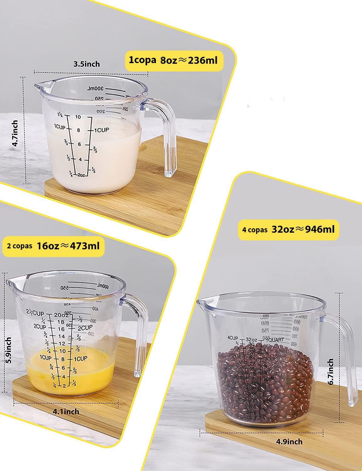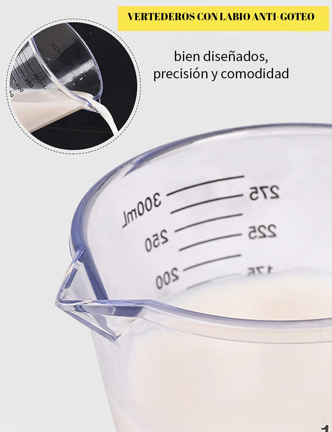 • ESCALAS VISIBLES Y FÁCILES DE LEER: Diseñadas con impresión en serigrafía negra de alta visibilidad, estas tazas medidoras transparentes ofrecen escalas en vasos, onzas y mililitros. Facilitan mediciones precisas sin errores, incluso con ingredientes opacos o en condiciones de poca luz.