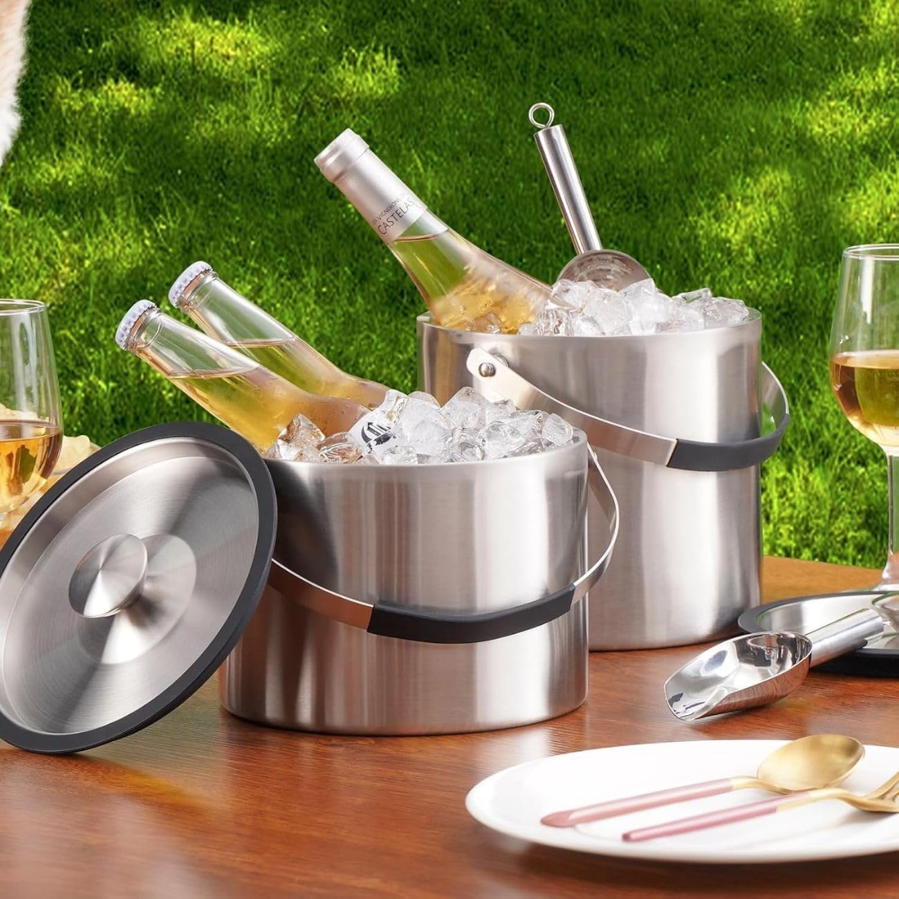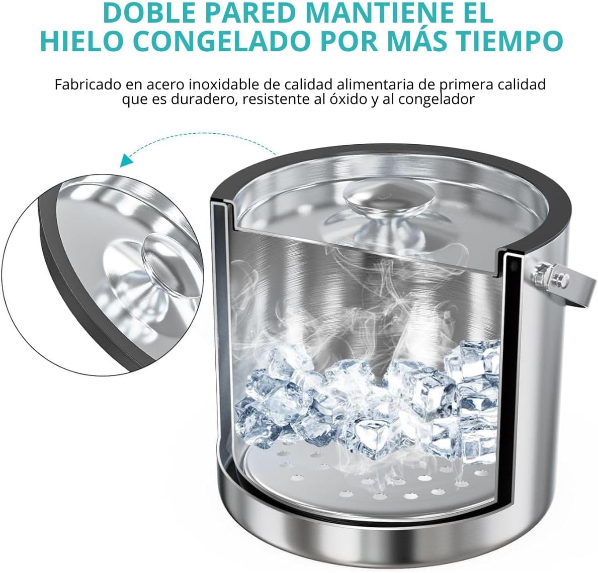 • MATERIAL DE CALIDAD: El cubo de hielo está diseñado con doble pared y tapa de acero inoxidable, este cubo garantiza un aislamiento superior, manteniendo el hielo fresco por horas y evitando la formación de sudor.