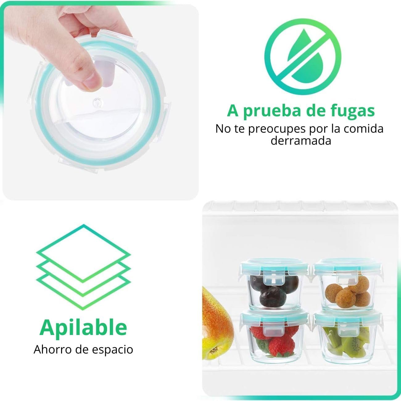 Diseño inteligente para organización: Equipados con tapas herméticas de bloqueo de 4 lados, estos recipientes aseguran la frescura de los alimentos y evitan derrames. Su diseño apilable optimiza el espacio de almacenamiento en el refrigerador o armario, facilitando la organización de la despensa o cocina.