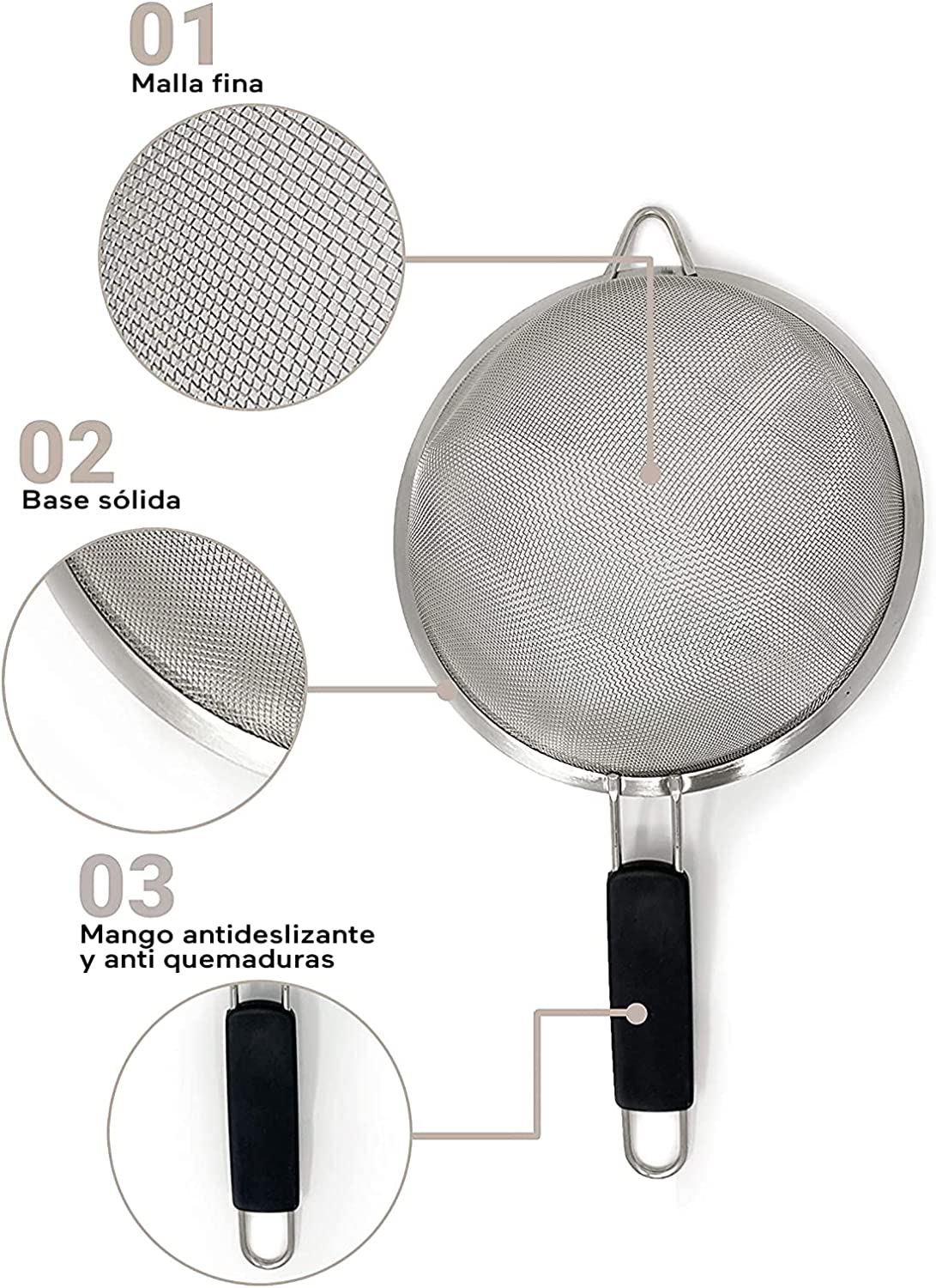 • ¡Evita accidentes! El colador de alimentos está diseñado para ser ligero, con una base sólida y un mango antideslizante para evitar quemaduras y accidentes.