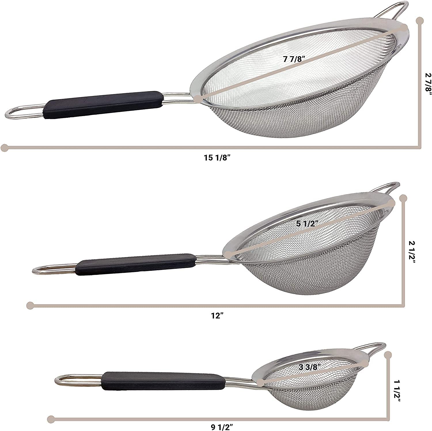• ¡Diferentes tamaños! Aprovecha sus tres variantes para ahorrar tiempo y hacer más eficiente el periodo de cocción de tus alimentos. El colador grande de 40 x 20 x 7.5 cm te permitirá dejar escurrir alimentos como pasta, quinoa o harinas; mientras nuestro coladero mediano de 32 x 14.5 x 7.5 cm es apto para azúcar, cocoa o canela; y finalmente el tamaño pequeño de 28 x 12 x 6.5 cm es perfecto para el café, té o cualquier otro ingrediente que se te antoje.