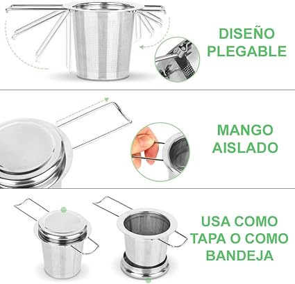 Diseño eficiente y funcional: Con una malla extra fina de distribución uniforme, nuestro filtro de té permite empezar fácilmente las hojas de té sueltas, incluyendo las más finas. Sus asas dobles de 5.7 pulgadas de ancho y 2.5 pulgadas de alto se ajustan perfectamente al borde de la copa o tetera estándar, facilitando su colocación y extracción sin ocupar mucho espacio. La tapa robusta de acero inoxidable mantiene el vapor y el té caliente, y también sirve como base para evitar mojar la superficie donde se coloca después de preparar el té. Dimensiones del paquete: 5.6 x 3.2 x 3.1 pulgadas.