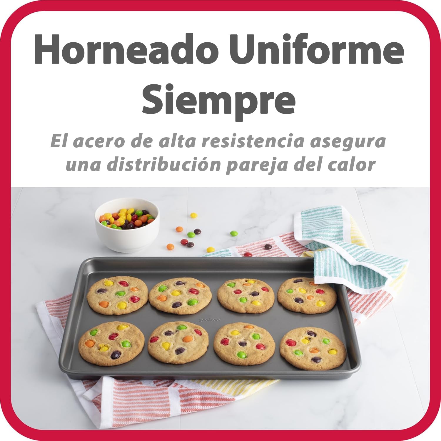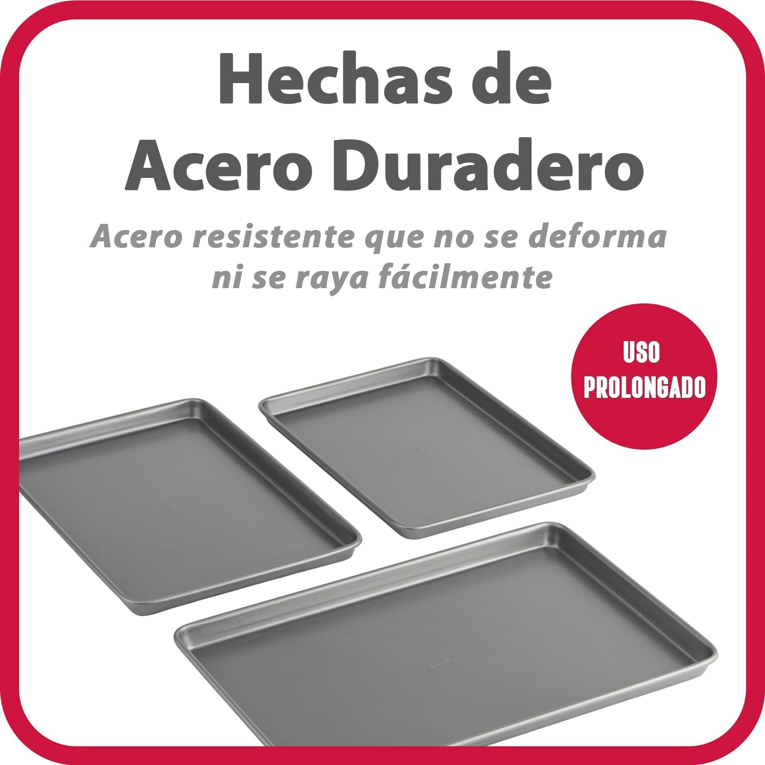 • DIFERENTES TAMAÑOS: El juego incluye 3 bandejas antiadherentes de distintos tamaños (13 x 9 in, 15 x 10 in, y 17 x 11 in), asegurando que siempre tengas la medida perfecta para cualquier receta, desde galletas y pasteles hasta verduras asadas.