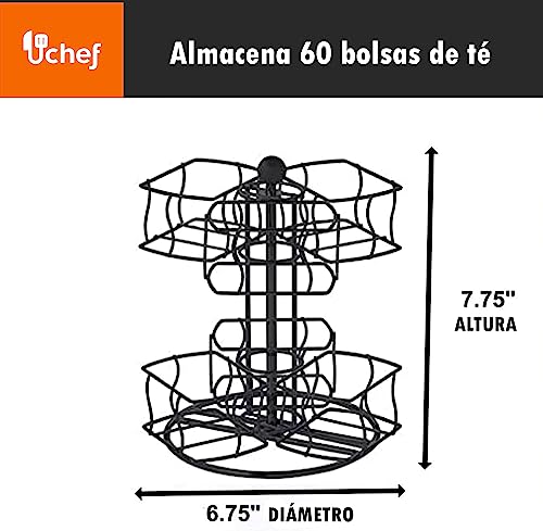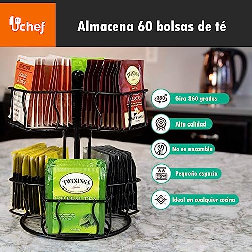 Organización Funcional: El organizador giratorio de U Chef exhibe con elegancia hasta 60 bolsas de té favoritas. Su plataforma gira suavemente 360 grados, facilitando encontrar rápidamente el té deseado. Ideal para mantener la cocina, dormitorio o cafeter’a de la oficina ordenados y accesibles, evitando la bœsqueda en cajones y armarios.