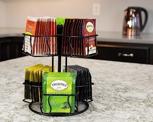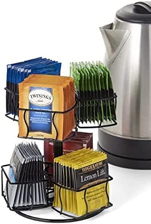 Estilo Moderno y Compacto: Con un diseño cromado moderno, este organizador se destaca en cualquier espacio. Con dimensiones de 7.75 pulgadas de altura y 6.75 pulgadas de diámetro, ocupa poco espacio en la encimera o en estanterías, complementando perfectamente otros accesorios de té y manteniendo todo organizado de manera eficiente.