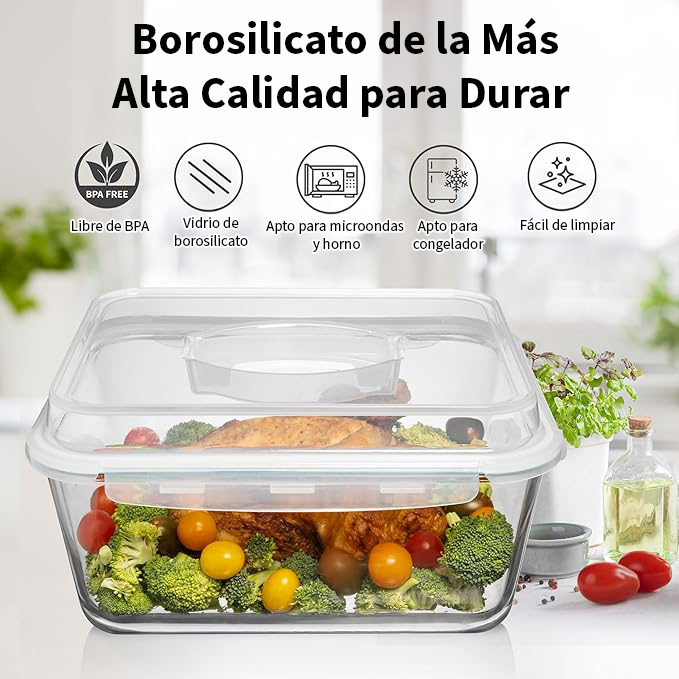 • RESISTENTE A LAS TEMPERATURAS MÁS EXTREMAS: Hecho de vidrio de borosilicato, este contenedor soporta un calor de hasta 980 °F y choques térmicos. Cocina, congela y recalienta tus alimentos con total seguridad, sin preocuparte por que el vidrio se rompa.