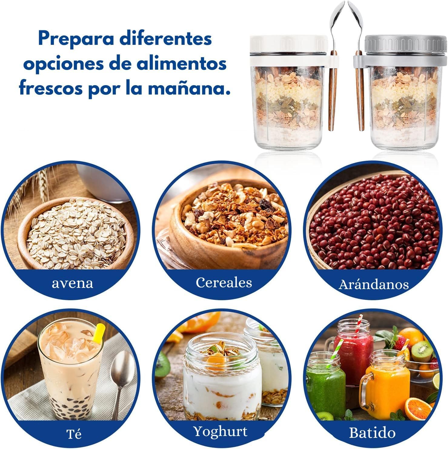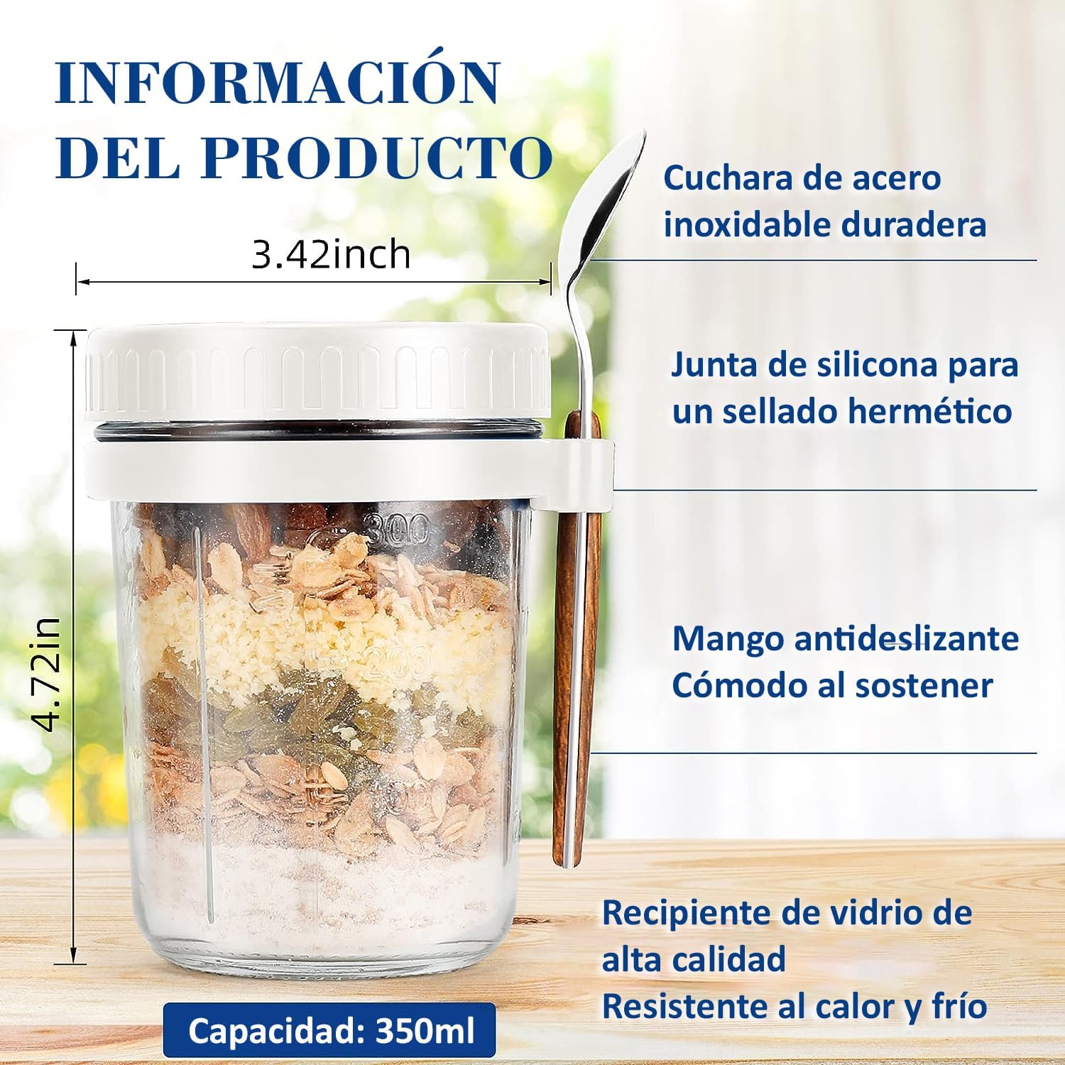 Alta calidad y diseño robusto: Fabricado con vidrio resistente a altas temperaturas de boro y una tapa de plástico de grado alimenticio con anillo de silicona, nuestro recipiente para avena es duradero y seguro. Su diseño hermético evita derrames incluso cuando está boca abajo, asegurando la frescura de tus alimentos en todo momento.