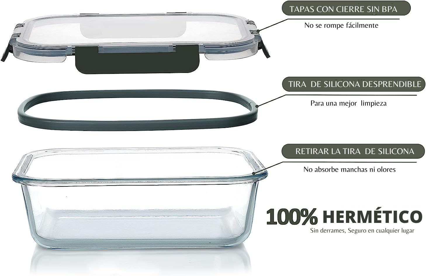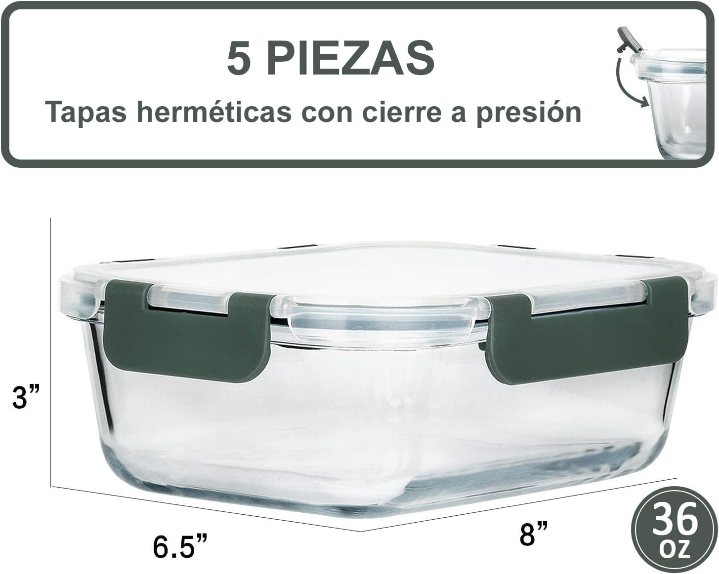 Preparación y almacenamiento eficiente: Nuestros recipientes de vidrio para alimentos de 36 onzas están diseñados para facilitar la preparación y conservación de comidas saludables. Fabricados con vidrio de borosilicato de alta calidad, ofrecen resistencia y durabilidad superiores. Sus tapas de cierre rápido con sellos de silicona aseguran un almacenamiento hermético, evitando derrames y manteniendo la frescura de tus alimentos por más tiempo. Ideales para usar en microondas, horno, congelador y lavavajillas, excepto las tapas.