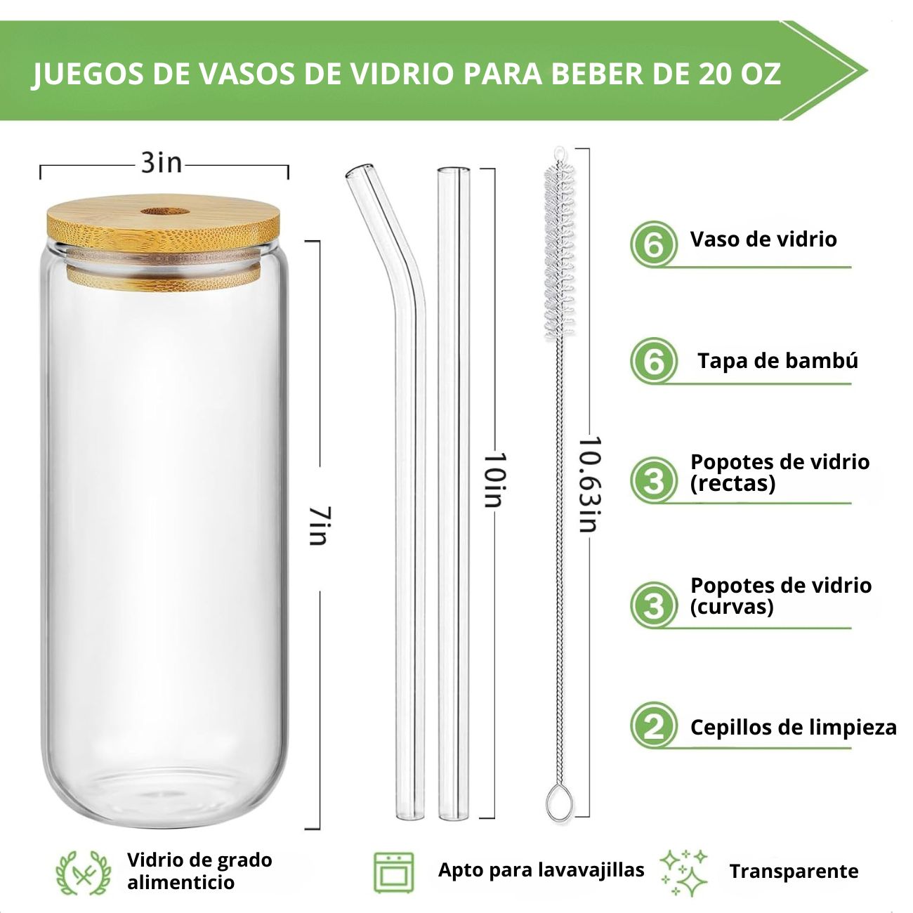 • SET COMPLETO Y DISEÑO ESTÉTICO: Obtén un práctico juego de vasos de vidrio U Chef de 6 unidades con capacidad de 20 Oz (aprox. 591 ml). Su diseño estético tipo lata es ideal, incluyendo cada uno su tapa de bambú y popotes de vidrio para una experiencia lista para usar