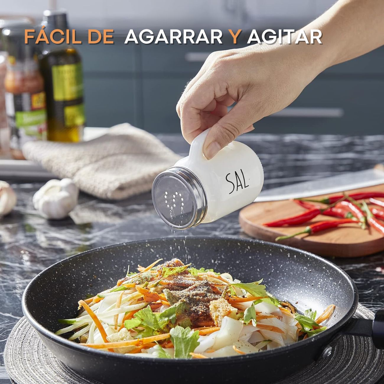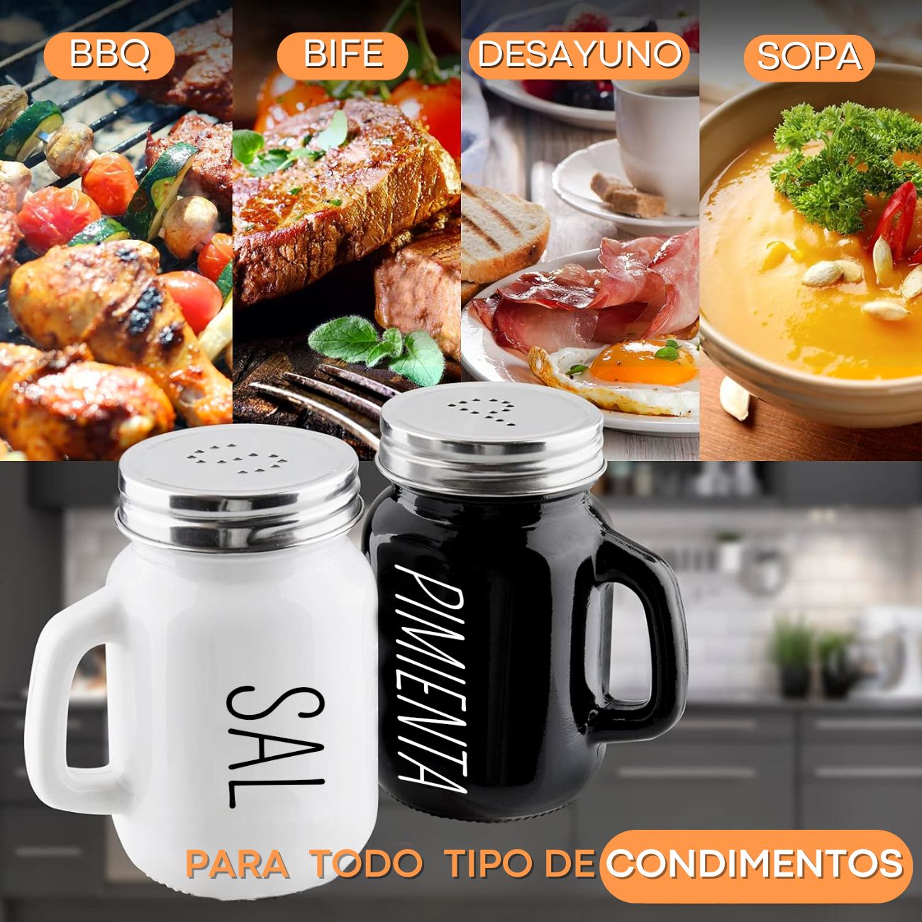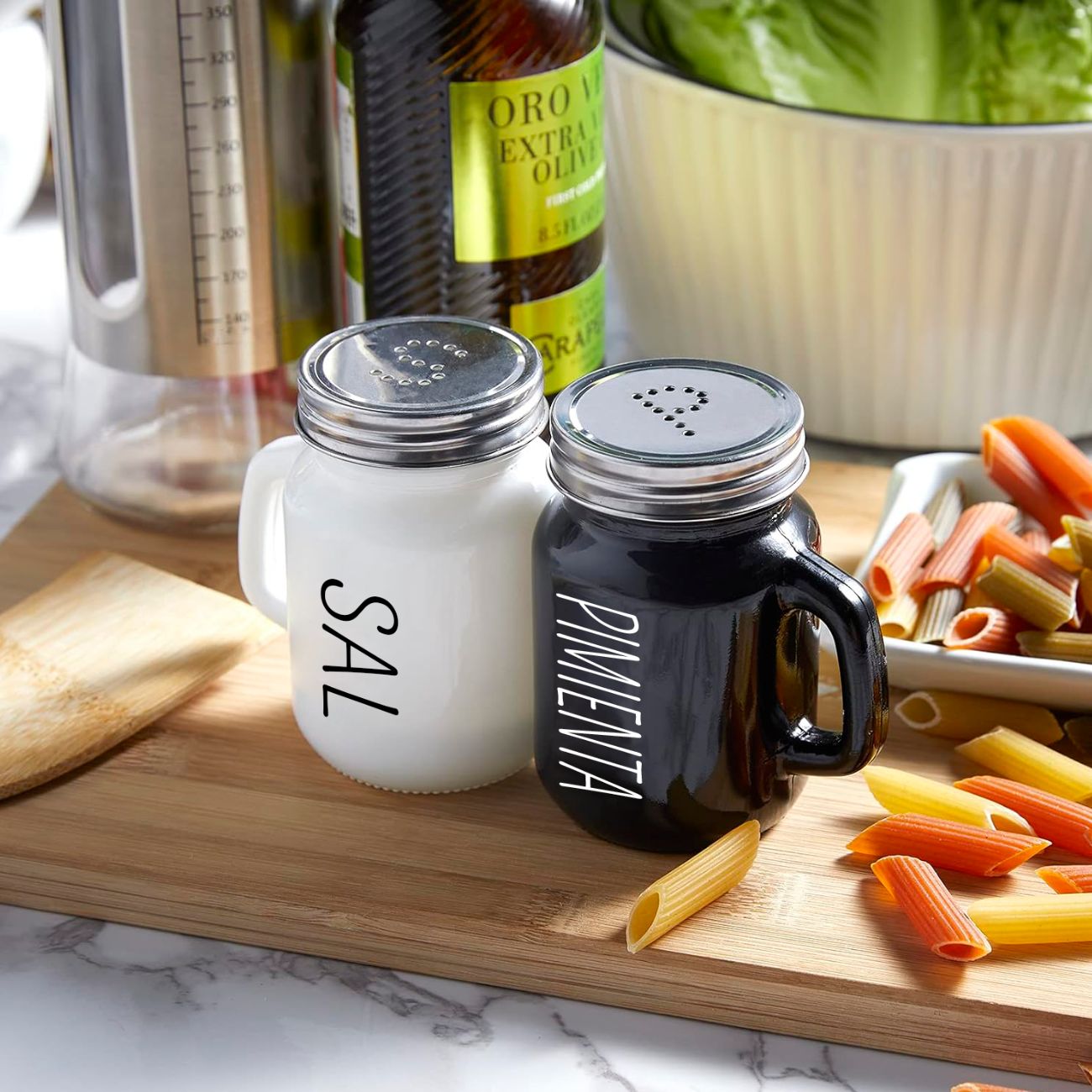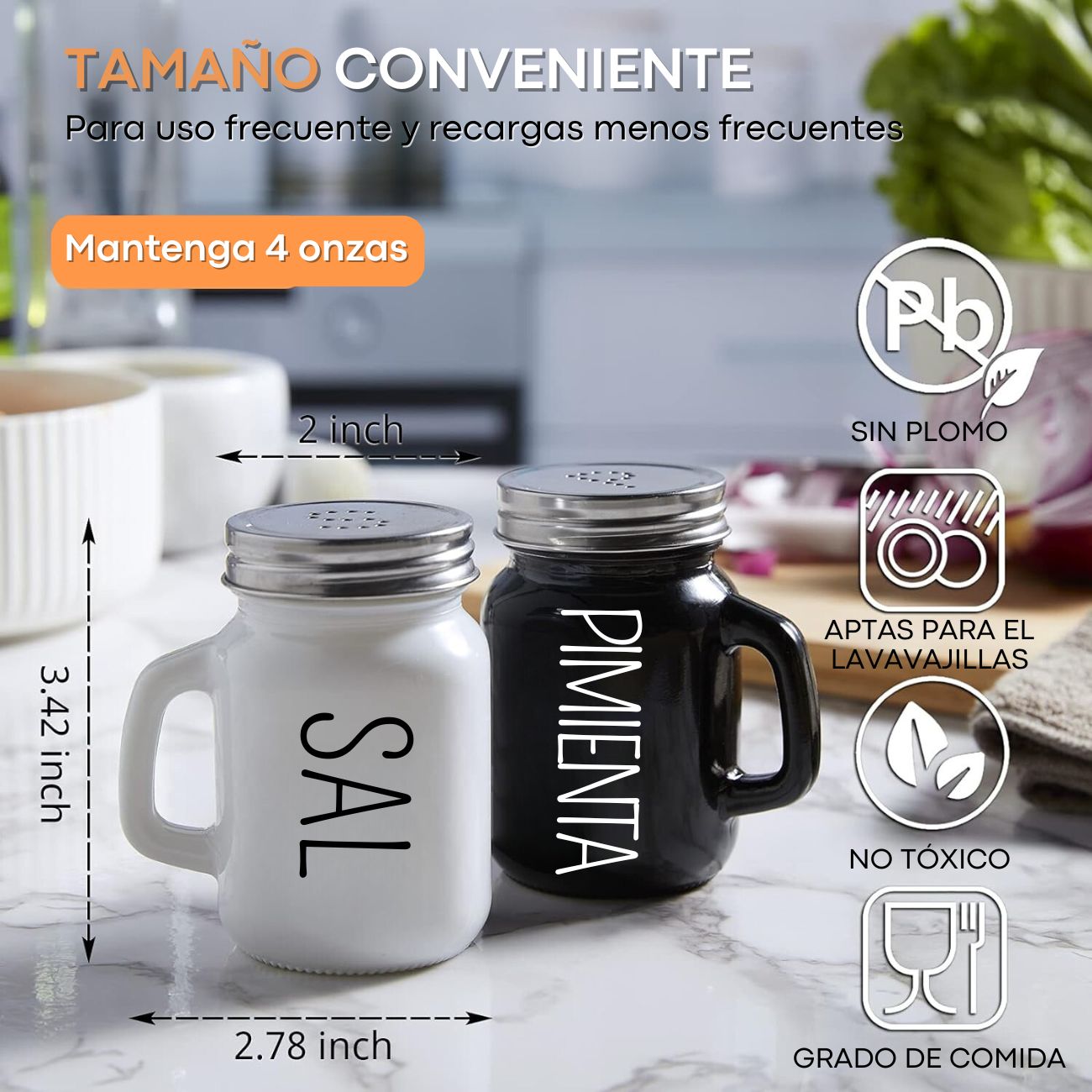 • IDEAL PARA USO DIARIO: Cada salero y pimentero tiene capacidad para aproximadamente 4 onzas, son del tamaño perfecto para uso frecuente y recargas menos frecuentes. Las letras en la tapa y las palabras en el lateral del recipiente te permiten dos formas de afirmar qué especia hay dentro. Este juego de saleros y pimenteros es ideal para cocinar, dispensar o usar en la mesa cuando estás comiendo.