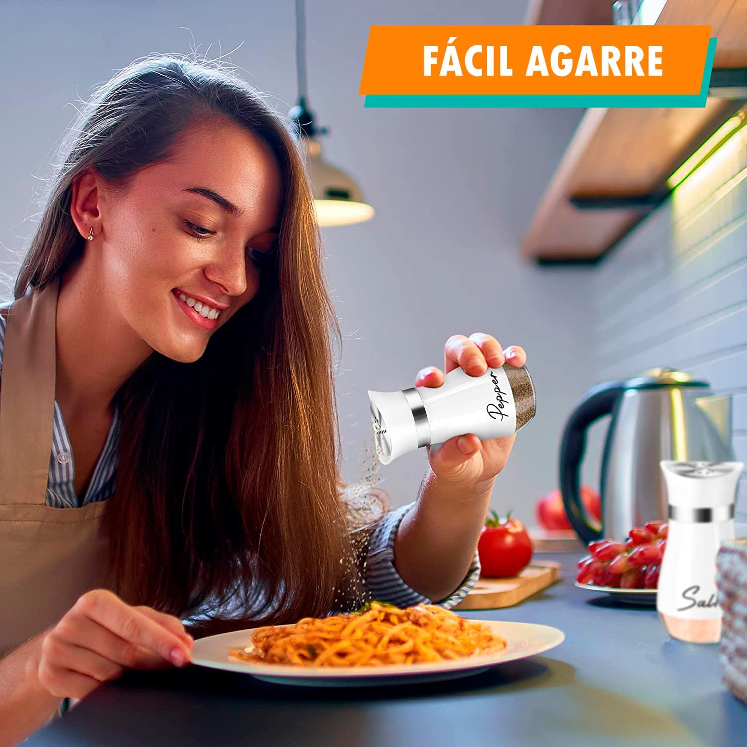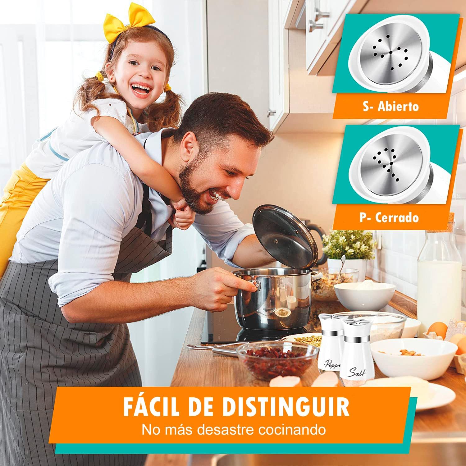 Diseño Eficiente y Moderno: Con dimensiones de aproximadamente 4.3 x 1.6 pulgadas y capacidad para 4 onzas (equivalente a 1/2 taza de especias), estos saleros y pimenteros son perfectos para reducir la necesidad de recargas frecuentes sin ocupar mucho espacio. Su diseño recargable es ideal para cocinas modernas y de estilo rœstico, así como para comedores y mesas. Con las palabras "sal" y "pimienta" impresas, garantizan un uso práctico y visualmente atractivo, asegurando que siempre uses el correcto.