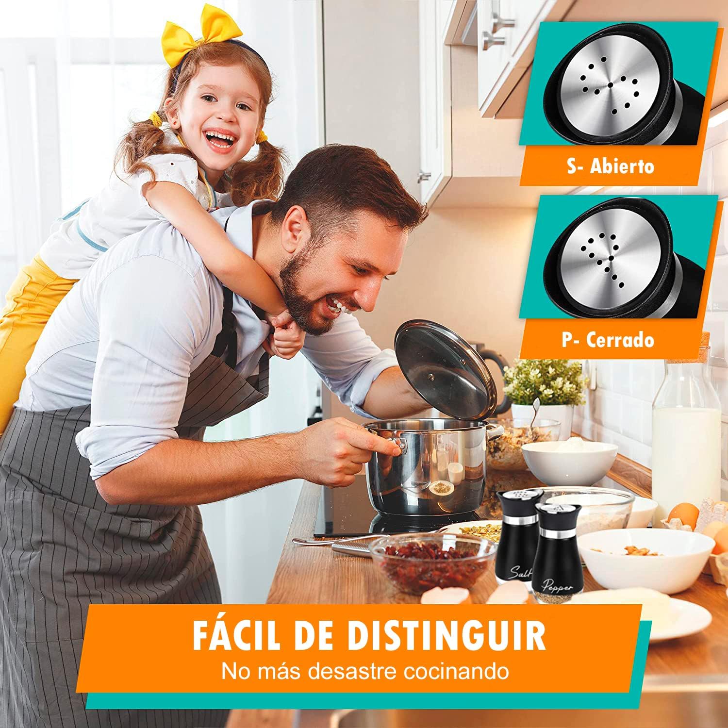 Operación Simple y Limpieza Fácil: Equipados con tapas de acero inoxidable con 11 pequeños agujeros ideales para un dispensado preciso, estos saleros y pimenteros minimizan el desperdicio y facilitan el proceso de condimentación. Su diseño transparente en la parte inferior permite ver cu‡ndo es necesario rellenar, mientras que la limpieza es rápida y sencilla: simplemente desenrosca la tapa para un lavado a mano eficiente y evita el lavavajillas para mantener su calidad.