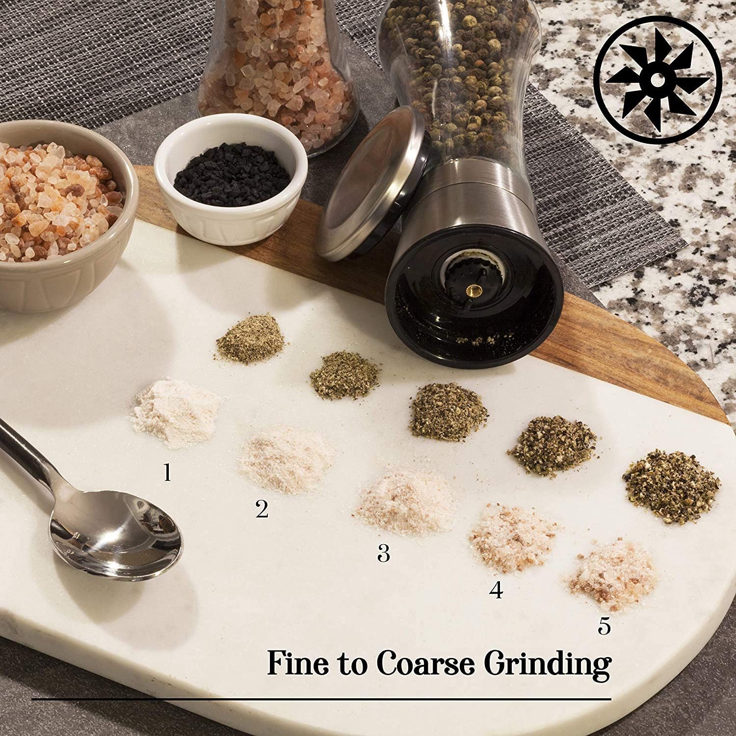 • Ajustables: poseen un rotor de cerámica más grande que el producto de la competencia. Simplemente gira la perilla en la parte superior de cada salero y pimentero para ajustar el grosor deseado de sal, pimienta o especias.