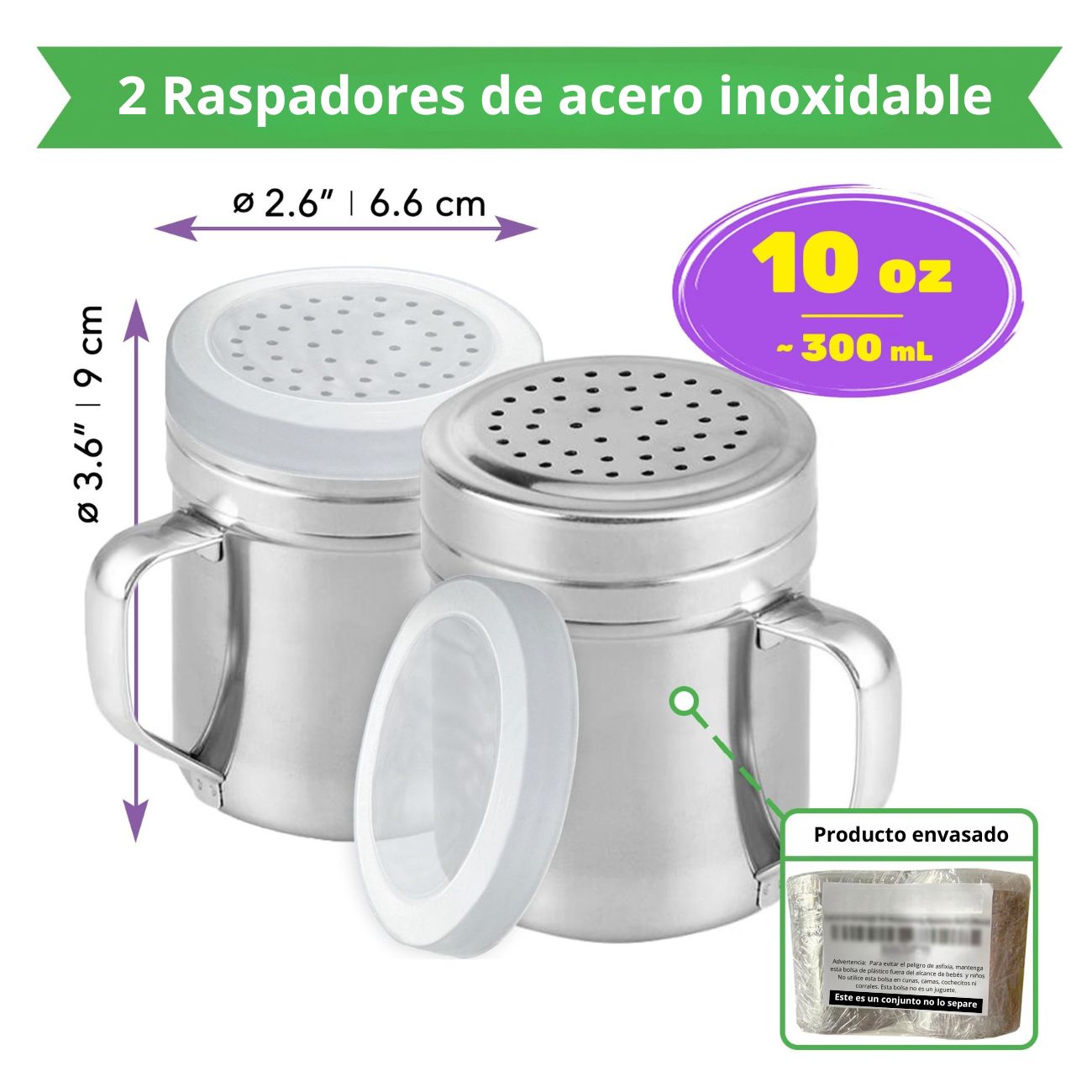 • PROTECCIÓN CONTRA LA HUMEDAD: Cada unidad incluye una tapa giratoria de metal y una cubierta protectora de plástico. Esta cubierta de plástico es esencial para mantener tu tamizador de azúcar o tus especias secas y protegidas de la humedad, preservando su frescura y calidad.