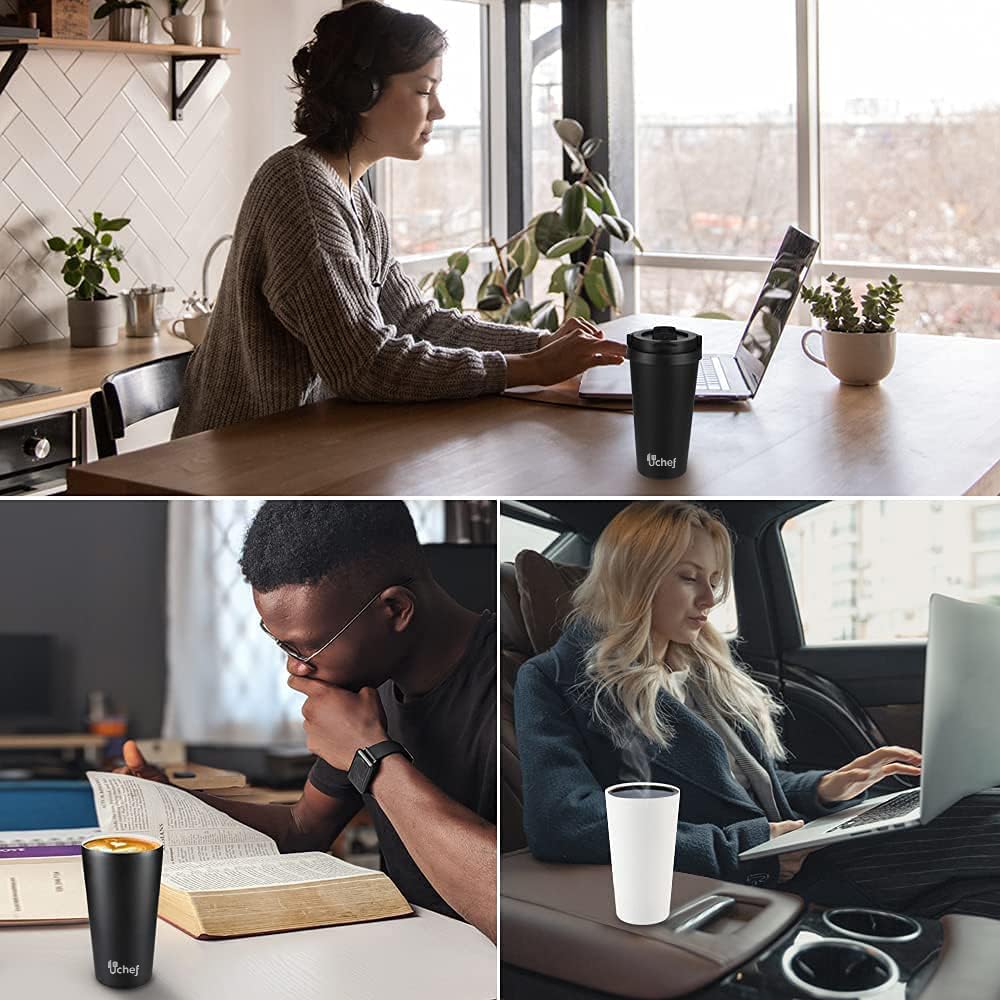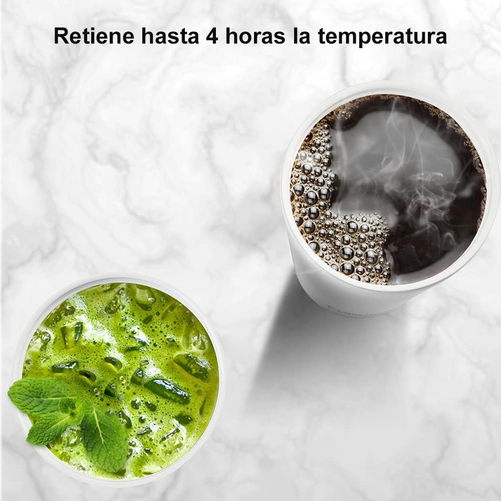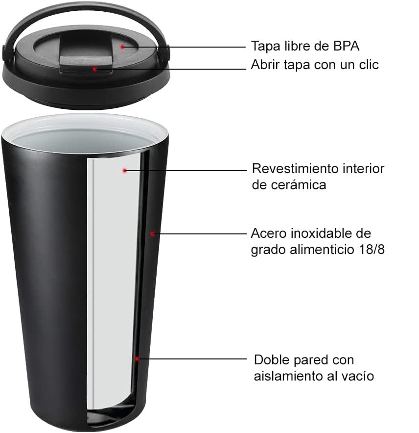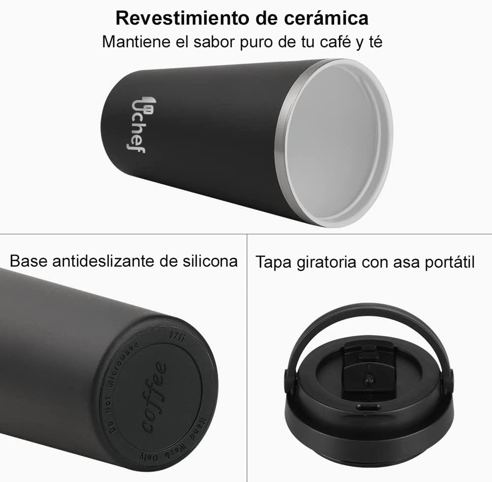 • Robusto y práctico: Equipada con revestimiento de cerámica interior para mantener las bebidas puras y sin sabor metálico, esta taza es ideal para café, té, vino y más. Su tapa a prueba de fugas y la base de silicona antideslizante aseguran un uso sin complicaciones en el coche, la bolsa o la mochila, ofreciendo comodidad y seguridad en todo momento.