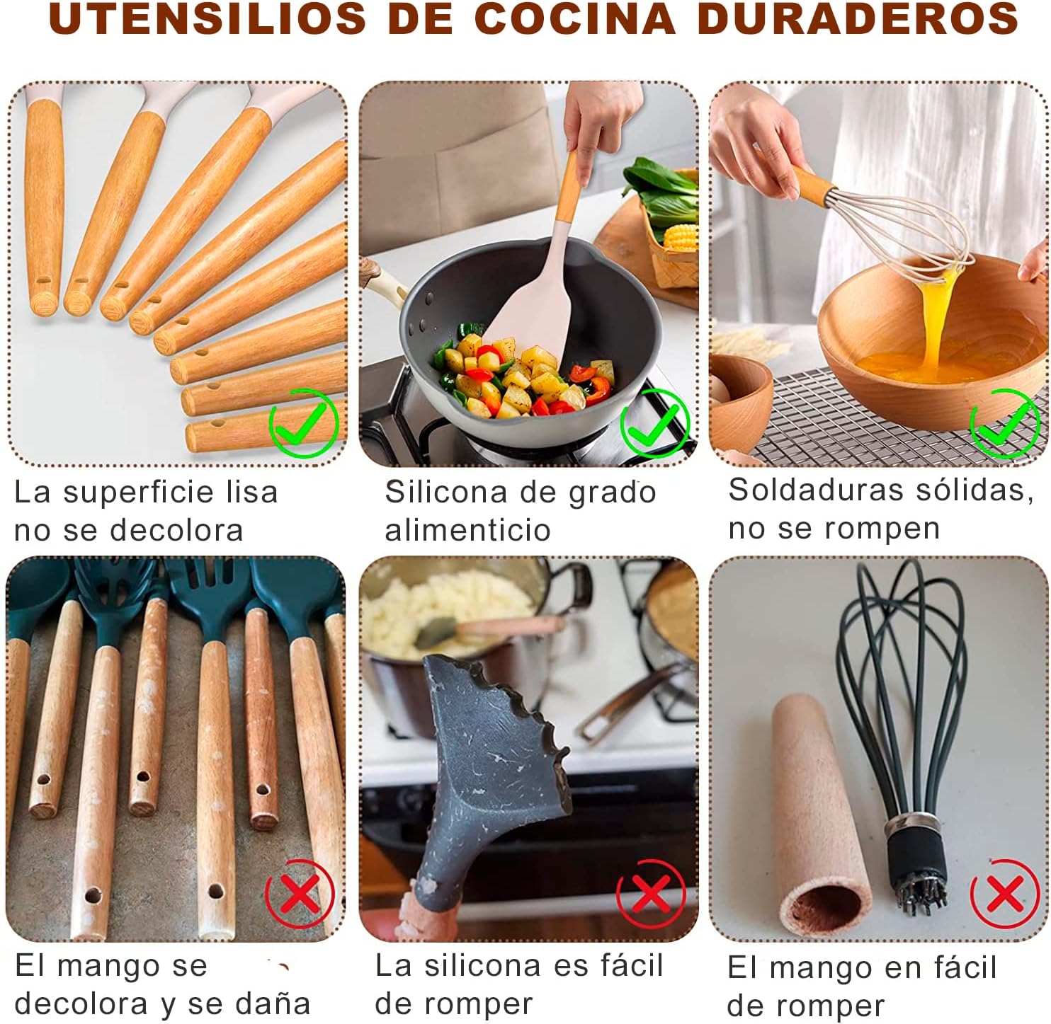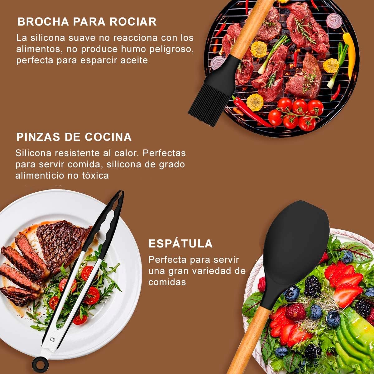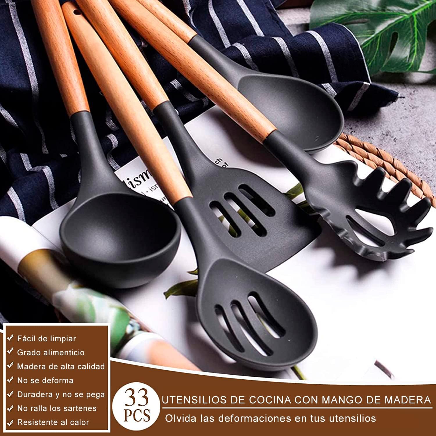 • Diseño Robusto y Funcional: Con un núcleo de acero inoxidable que mejora la resistencia y previene la deformación, estos utensilios están construidos para durar. Resisten temperaturas altas hasta 446.0 ¡F y protegen las superficies de tus sartenes gracias a sus cabezales de silicona. Además, el juego completo de 33 utensilios incluye desde espátulas flexibles hasta pinzas y cucharas, satisfaciendo todas tus necesidades culinarias con comodidad y facilidad de almacenamiento.