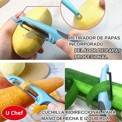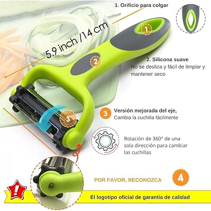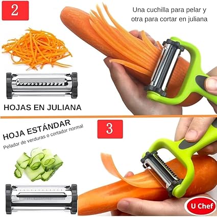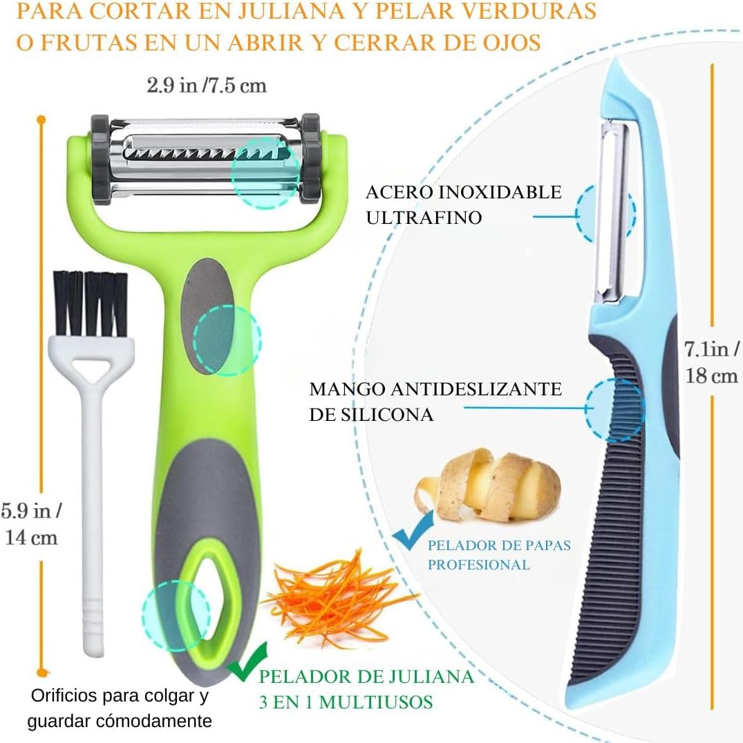 • Pelador 3 en 1: Este innovador pelador cuenta con tres cuchillas especializadas. La cuchilla estándar es ideal para pelar cáscaras duras de frutas y verduras, como calabacines y papas. La hoja dentada se adapta perfectamente a cáscaras suaves o duras de frutas, como tomates y manzanas, permitiendo un pelado sin dañar la pulpa. Además, la cuchilla Julienne facilita la creación de tiras finas de zanahorias o calabacines, haciendo que la preparación de ensaladas vegetarianas sea más sencilla y rápida.