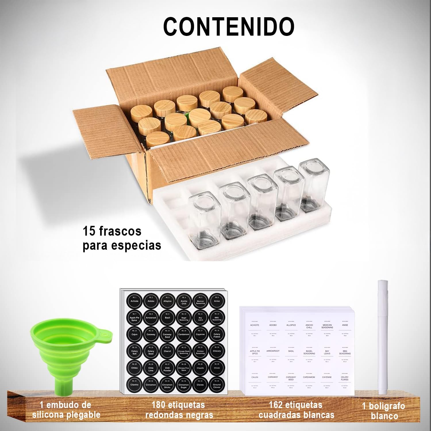 • PRÁCTICO Y ÚTIL: Los especieros para cocina incluye 24 frascos de vidrio de 4 oz con tapas de bambú, 180 etiquetas redondas negras, 162 etiquetas cuadradas blancas, 42 etiquetas en blanco, un catálogo de especias, un marcador y un embudo. Todo lo necesario para almacenar, identificar y mantener tus especias frescas y ordenadas.