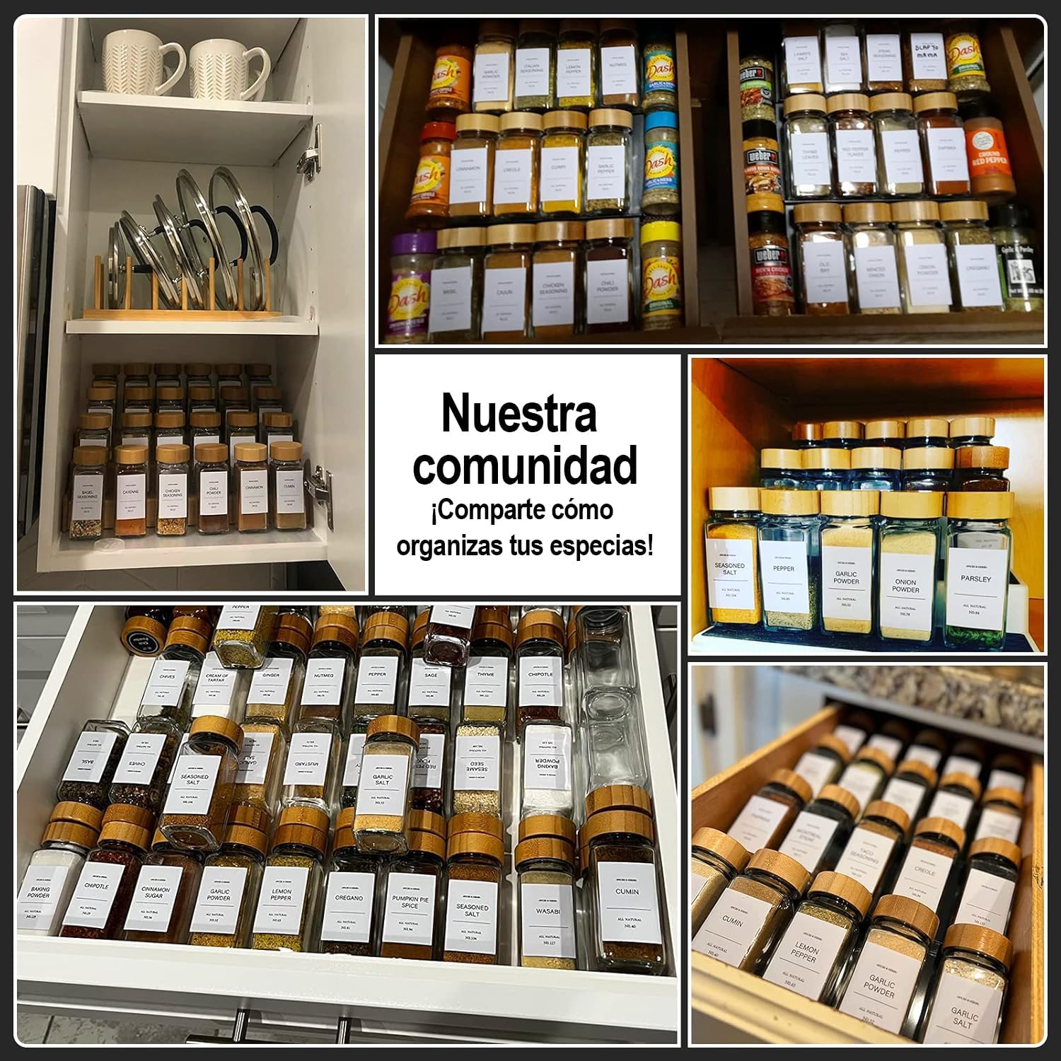 • ETIQUETADO PERSONALIZABLE: Los Especieros de vidrio incluye 150 etiquetas preimpresas con nombres de especias, 42 etiquetas en blanco para personalizar y un marcador. Gracias a su diseño claro y práctico, localizar y clasificar cada especia será más fácil y rápido, manteniendo la cocina bien organizada.