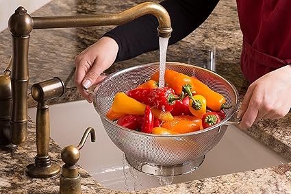 • ALTA CALIDAD: Fabricado con acero inoxidable 18/8 a prueba de óxido y equipado con asas remachadas, este escurridor de verduras está diseñado para soportar los rigores de una cocina profesional, ofreciendo durabilidad y resistencia a largo plazo en cualquier entorno culinario.