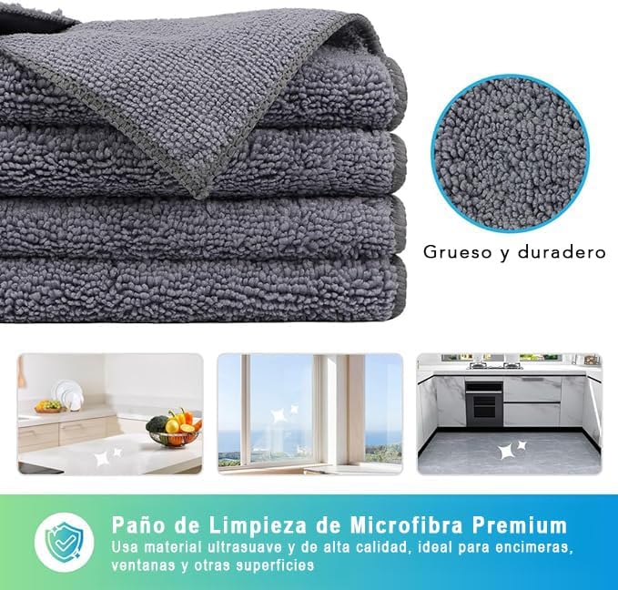 • LIMPIEZA EFECTIVA Y MUY ABSORBENTE: Con este paquete de 12 paños de limpieza de microfibra, lograrás resultados prolijos, sin manchas ni rayas, en múltiples superficies. Son toallas de microfibra altamente absorbentes, diseñadas para capturar líquidos y suciedad rápidamente con mínimo esfuerzo.