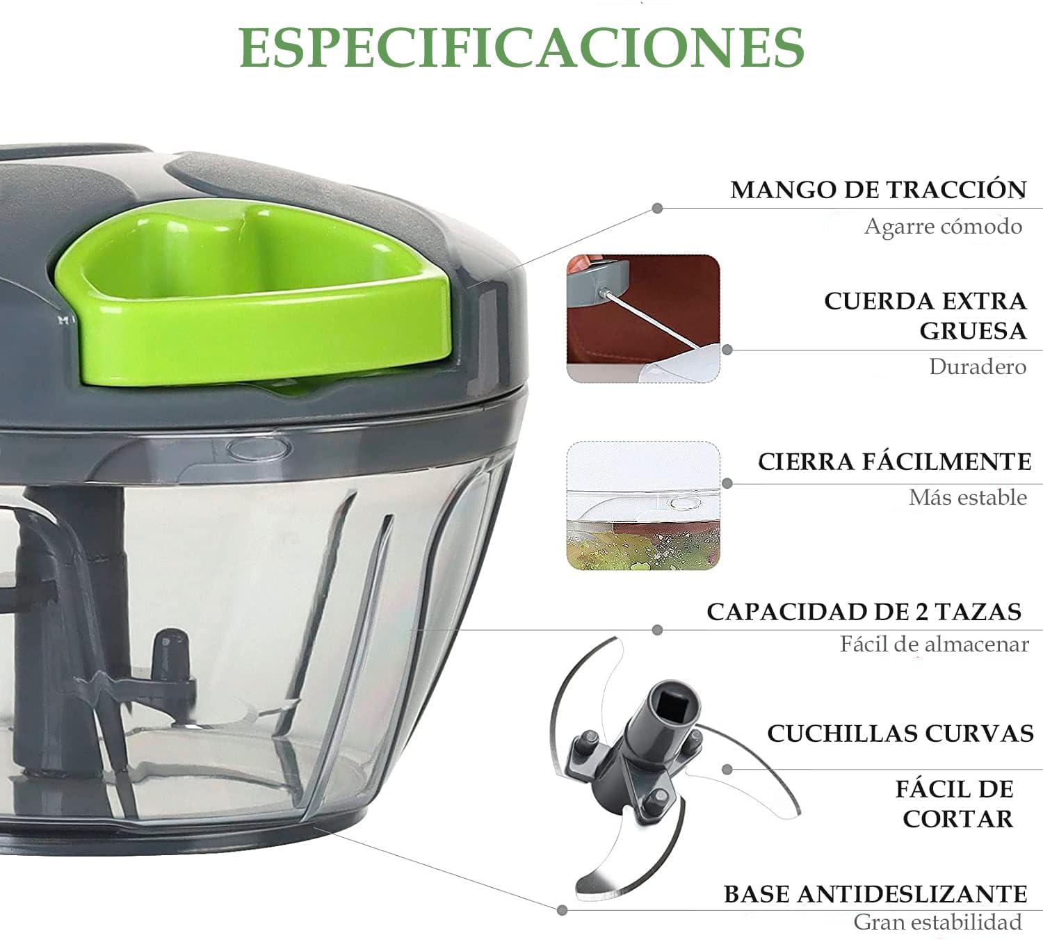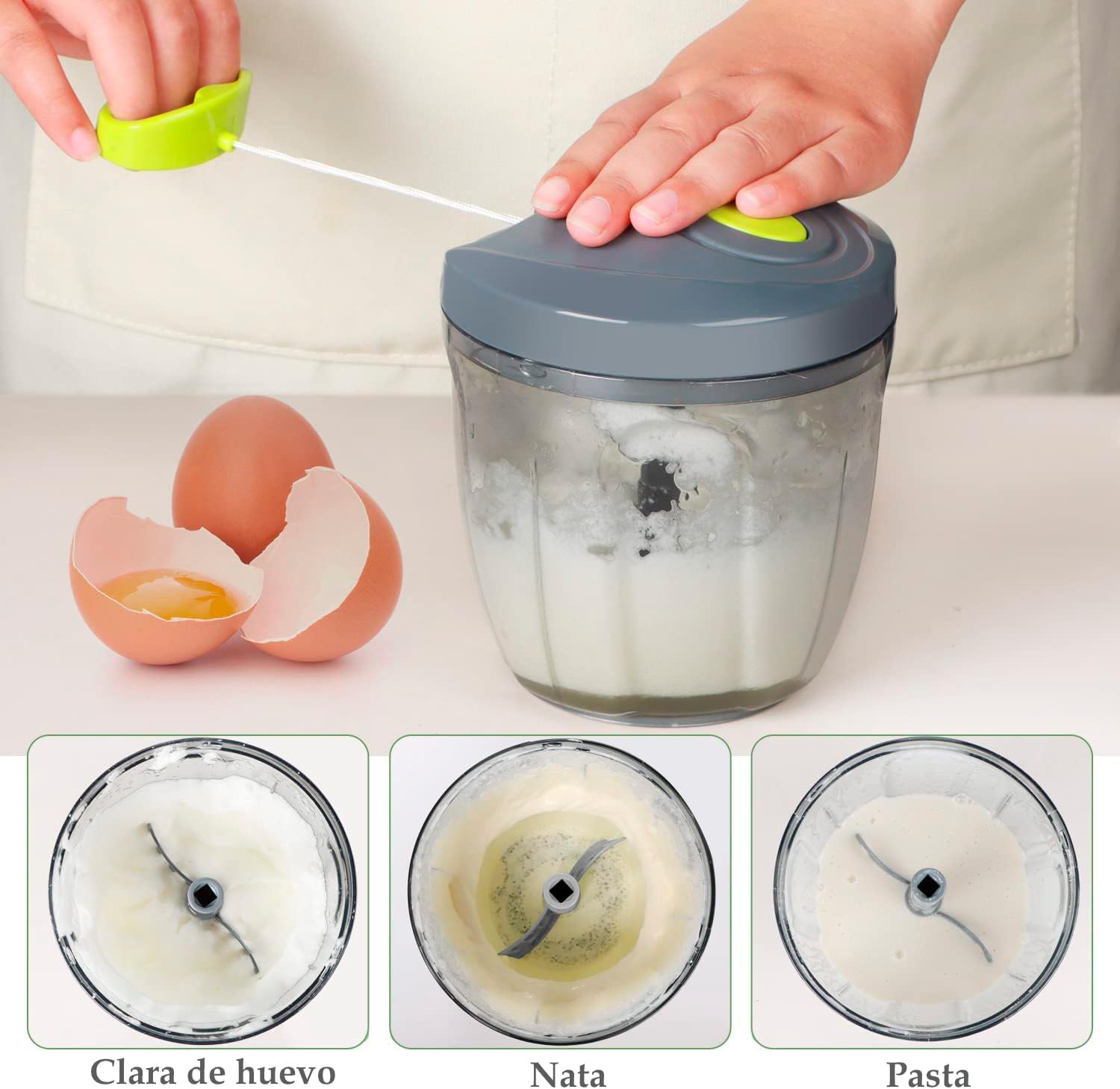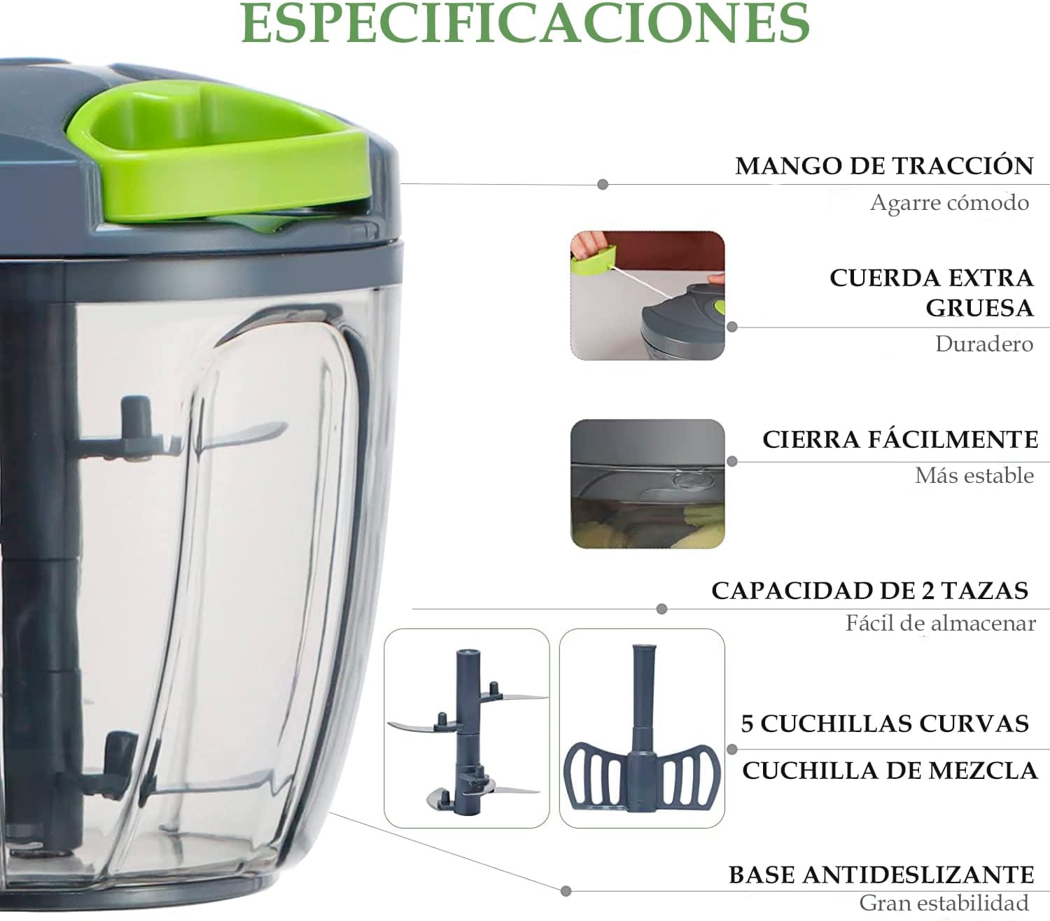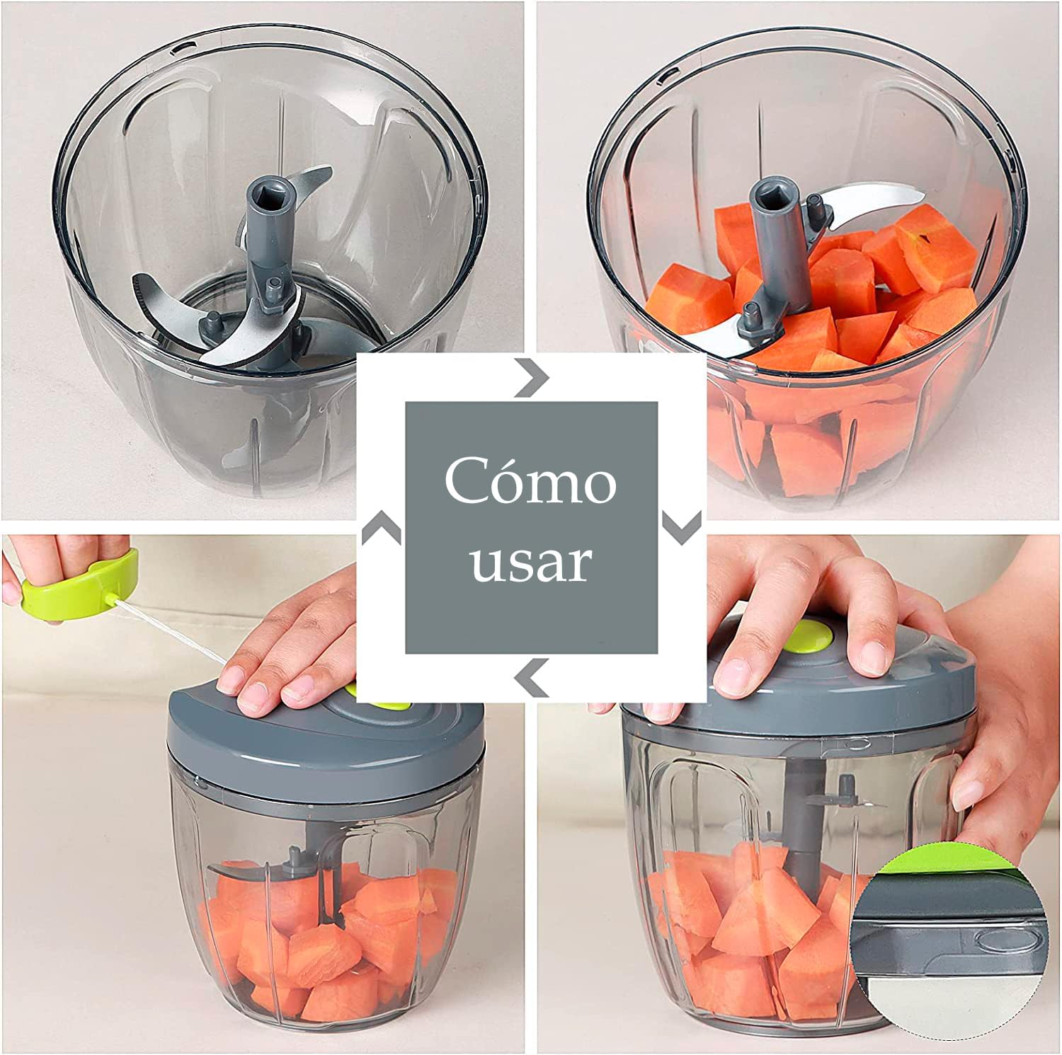 Eficiencia en la Cocina: El procesador manual de alimentos U Chef es indispensable para reducir el tiempo y esfuerzo en la preparación de comidas. Con solo tirar del cable varias veces, puedes picar r‡pidamente verduras, carne deshuesada, frutas, nueces y más. Su diseño permite controlar el tamaño de los ingredientes según la cantidad de veces que tires del cordón, asegurando cortes finos o gruesos segœn lo necesites. Equipado con un cuenco transparente de 4 tazas para una fácil visualización y 5 cuchillas curvadas de acero inoxidable que ofrecen un corte rápido y preciso, incluyendo un batidor adicional para cremas y claras de huevo.